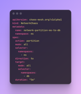 In a microservices architecture, your service is only as reliable as the services it calls. We use NetworkChaos to simulate a “Partition” where traffic to specific internal dependencies is completely cut off.