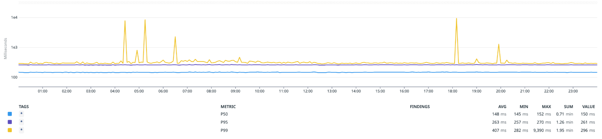 As you can see, our p50 and p95 values are as expected, but we have some spikes on p99, which may take up to several seconds.