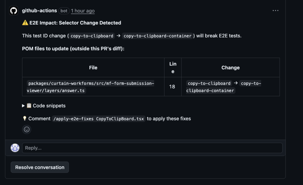 E2E tests rarely fail because of a single dramatic change. More often, they fail because of small, reasonable changes that accumulate over time. A selector is renamed, a component is refactored, or a feature is gated. Each change makes sense on its own, yet the impact on E2E tests is usually discovered only after the code is merged, by which time context is already lost.