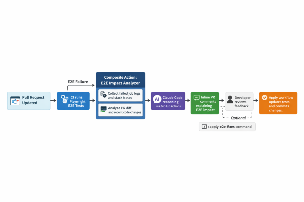 In practice, many E2E failures are regressions introduced by recent UI changes. The failure shows up in CI, but the connection to the original pull request is no longer obvious. By the time someone looks at the failure, the PR is merged, the reviewer has moved on, and the failure feels disconnected from the original decision.